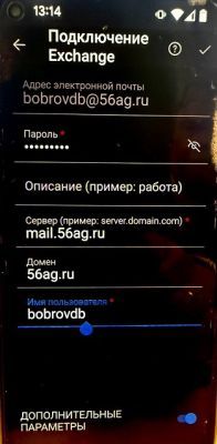 6. Далее в окне «Подключение Exchange» проверьте, что в поле «Сервер» стоит значение mail.56ag.ru. В поле«Пароль» нужно вписать свой пароль.В поле «Домен» нужно написать«56ag.ru», а в поле «Имя пользователя» укажите свою учетную запись в формате «имя_пользователя», не используя приставку @56ag.ru.